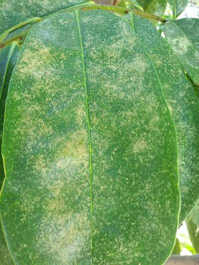 Olá! As manchas esbranquiçadas nas folhas são danos causados por ácaros. Veja em Ácaro-aranha algumas dicas de controle.