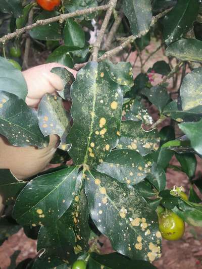 O fruto(limão cravo) ficou com essa aparencia, algumas folhas apresentam manchas pretas(e imagina). Mas o que mais intrigou foi a coloração do limão que ficou com esse aspecto enrugado.