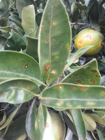 Gostaria de saber o que é e como resolvo esse problema que esta ocorrendo na laranjeira... parece ferrugem e antracnose.