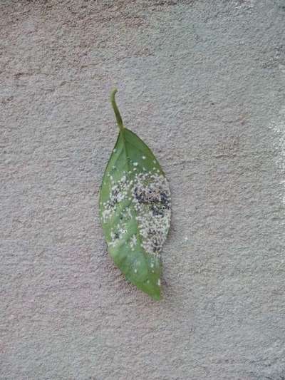 A parte preta são as fezes, do que parece ser cohonilha farinha mas pode ser pulgão branco, a resolução da foto não permitiu ver na aproximação. Tratamento com calda bordalesa (sulfato de alumínio) tem formulação pronto uso no mercado. 3 aplicações de 15 em 15 de. Procure um agrônomo.