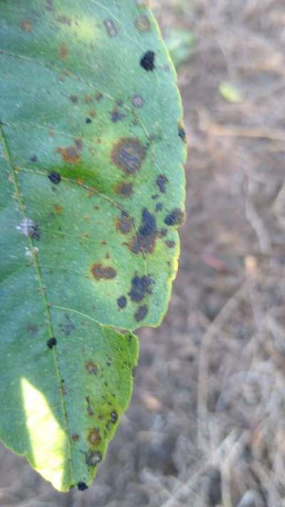 Manchas de coloração escura com pontos de distribuição por toda a folha tanto na parte axial quanto abaxial.