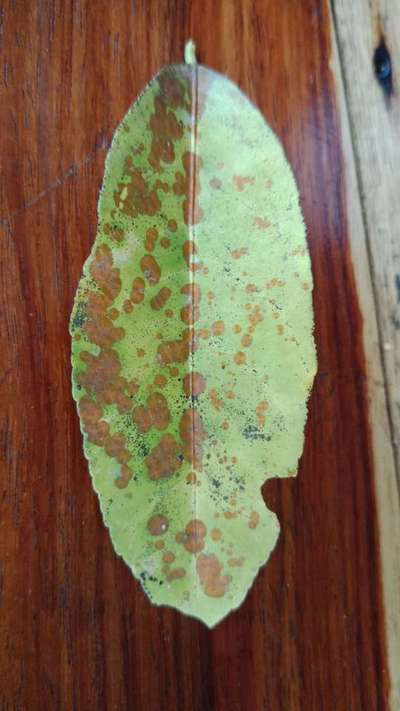 Não e mancha de alga. A folha não fica perfurada, e parece q ela fica por cima da folha. Ela fica amarelada e com estas manchas alaranjadas.