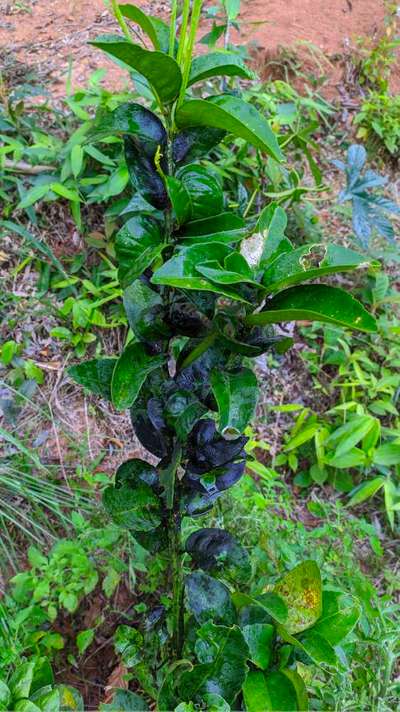 Provavelmente isso é Fumagina devido a existência de Pulgão Verde dos Citros ou Cochonilha Negra. Use para pulverizar: 10 ml de álcool 10 ml de detergente 20 ml de óleo de cozinha Diluído em: 500 ml de água. Caso vc tenha muitos pés da cítrica, alimente a receita proporcionalmente. Espero ter lhe ajudado.