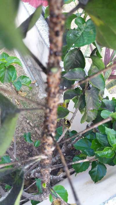 Esse hibisco tem flores lindas, mas não sei como tratar dessa coisa que apareceu nos galhos.