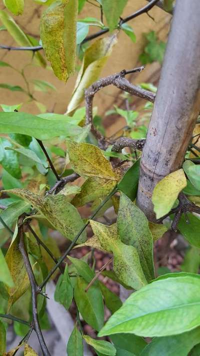 Olá, alguém sabe o que pode ser essas manchas na folha do limoeiro? O tronco está cheio de pontinhos brancos que não se mexem. Obrigada