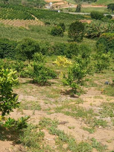 Que causa o amarelão total nos citrus, como nessa planta totalmente amarela ao fundo da foto