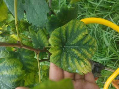 Algumas das folhas mais velhas estão com essas características. Foi feita adubação nitrogenada, de boro e também magnésio. Preciso confirmar se é K ou mesmo Mg; cultivar de uva tinta. É possível ver também que as folhas estão recurvadas...