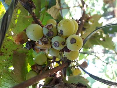 Acredito que seja antracnose. É um fungo que ataca as plantas. Nas parreiras deve-se aplicar calda bordalesa a cada 15 dias
