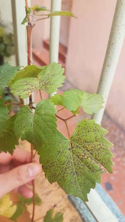 Essa parreira em vaso tinha uns 4 metros, de repente secou e morreu. Nasceram três pés, mas as folhas logo ficam com estes pontos pretos e vão secando... Parece ser uma deficiência... Mas não sei do que