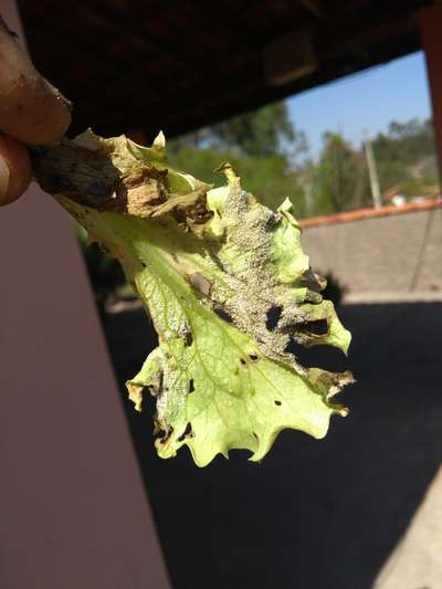 Notei essas manhas de verde mais claro nas folhas deste pé de alface. Já trabalho há algum tempo com alface e ainda não tinha observado tal sintoma. Apesar de parecer doença fúngica, não conheço doenças com tal sintoma no alface. Não me parece característico de deficiência nutricional. Um amigo falou que parece com ataque de minadora, eu, sinceramente, não acho que seja. Alguém tem uma opinião?