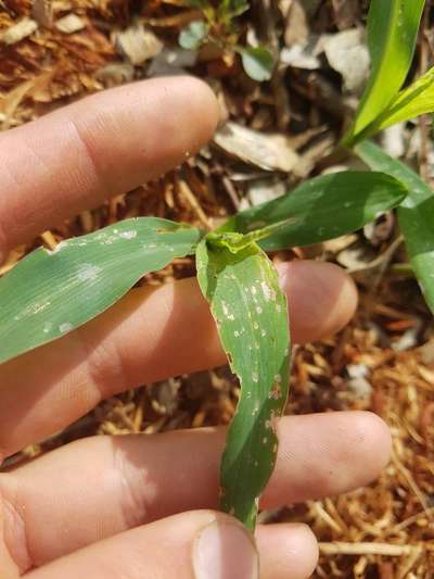 Todos os meus brotos de milho estão assim, quando olho de perto parece que tem uma mosquinha comendo. O que pode ser??