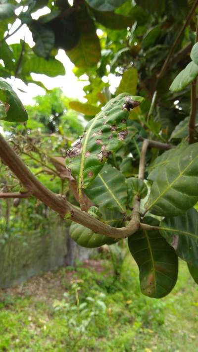 Olá Joao Batista Dos Santos Santos Nas folhas, os sintomas podem ser fungos. Uma possibilidade é Antracnose em manga e mamão do cajueiro Retire ramos e folhas afetadas e utilize a calda bordaleza podem auxiliar no controle.