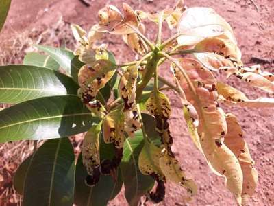 Olá Cleudilene Santana Fonseca ! Sua planta está com Antracnose em manga e mamão . Nas folhas ela provoca exatamente estes sintomas. A calda bordalesa ajudará no controle.