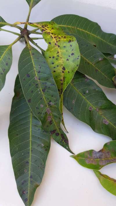 Por favor, alguém sabe como resolver esses problemas com pé de manga? As folhas estão caídas pra baixo, meio sem vida, com manchas pretas e com manchas cinzas. Os frutos também tem manchas pretas, e parece que os frutos estão aparecendo antes ( inverno), geralmente dava no verão. Obrigada