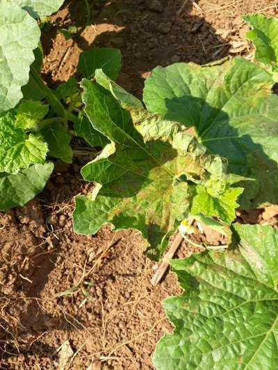 Olá veja se o sintoma é parecido com Míldio de Cucurbitáceas Na parte de baixo das folhas há presença de mofo?