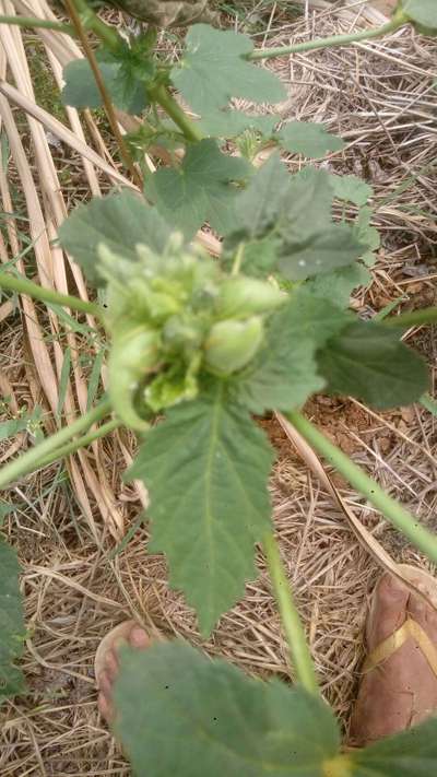 Este quiabo esta com uma infestação de pontinhos branco entre os fruto e os mesmos estão saindo agrpmerados de mais sem espaços entre os frutos
