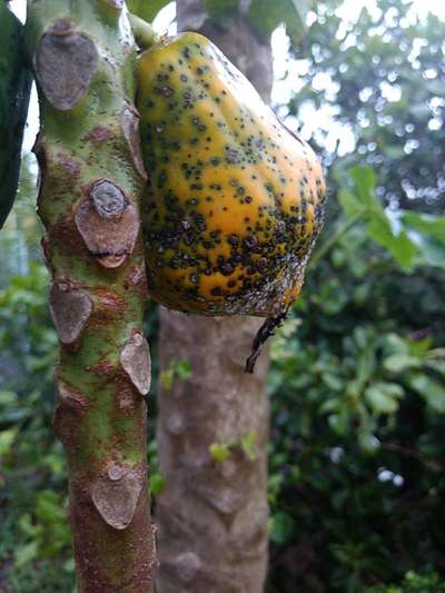 Os mamões já começa a ficar todo pintado ainda verde, as folhas ficam também pintada amarelada. Não salva nenhum mamão.