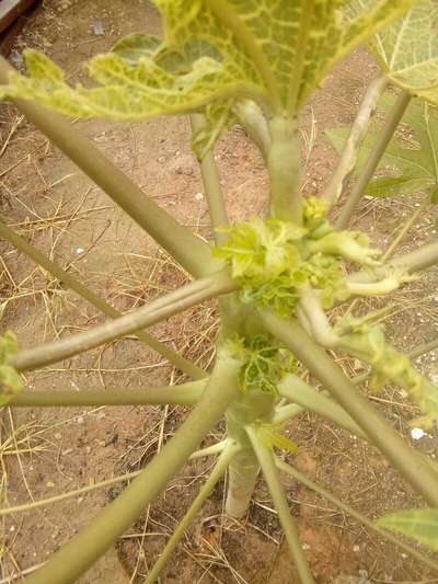 É o segundo mamoeiro que planto que ao atingir uma altura de mais ou menos 1 metro, as folhas do broto começam a enrrugar e nao desenvolvem mais. A partir daí todas as folhas saem pequenas e atrofiadas, em um tom verde claro.