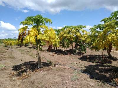 Boa tarde minha plantação de mamão tem apresentado esses sintomas.. alguém sabe identificar qual o problema?