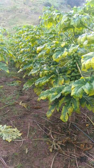 Doença que deixa as folhas do mamoeiro pintada e, em casos mais graves, as queima e as engruvinha começando pelas extremidades. Os frutos apresentam manchas fúngicas cinzentas. Ao abrir o mamão verifica-se nódulos onde se encontra a mancha.