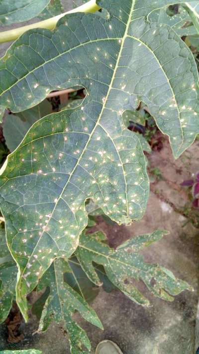 Saiba mais sobre o PlantixNo meu mamoeiro tem várias manchas brancas com bordas amareladas nas folhas. No dorso das folhas as manchas são escuras.