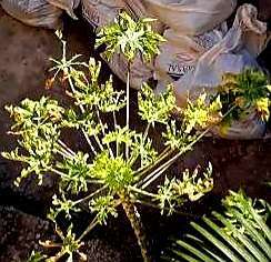 Sintomas nas folhas velhas e mais do lado voltado para o sol