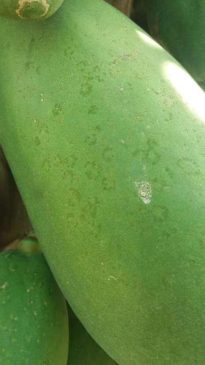 As folhas permanecem normais, os outros mamões até agora não estão infectados. Existem pequenos buracos no mamão que estão permitindo a entrada de formigas