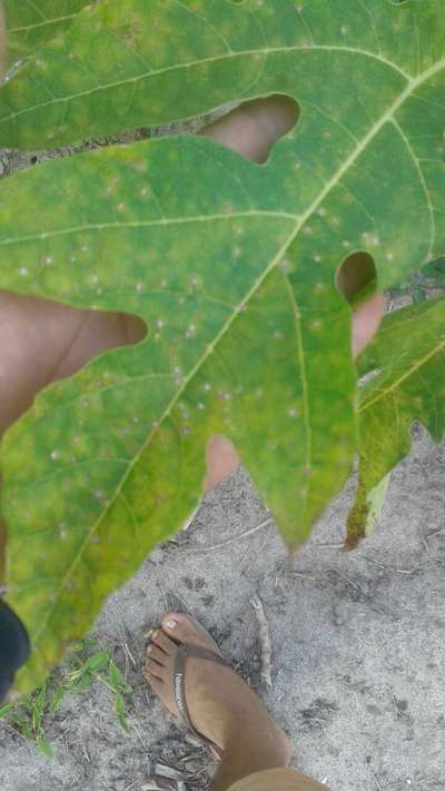 As folhas ficam com pinta branca aí as folha muchas já tá passando pro mamão