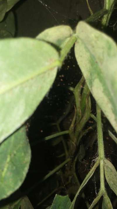 Teia com pintinhas vermelhas, deixando as folhas amarelas