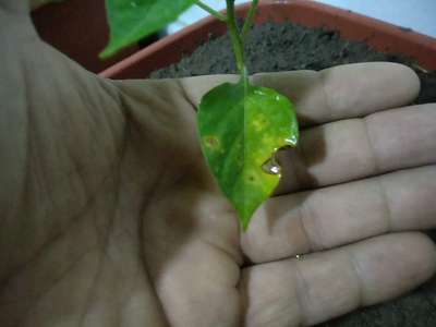 Preciso de ajuda para identificar e tratar um problema em uma muda de pimenta bode (cheiro). Aqui pelo aplicativo, pelas fotos, fiquei na dúvida se poderia ser antracnose ou mancha bacteriana.