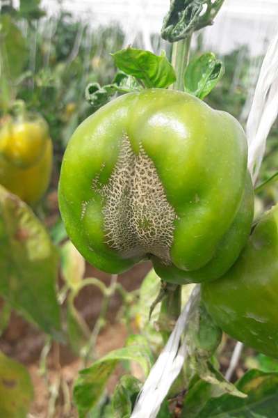 Pimenta e pimentao com folhas enrugadas