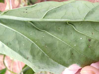 As folhas do topo ficam enrugadas, duras e voltadas para baixo. Cultura: Pimentão