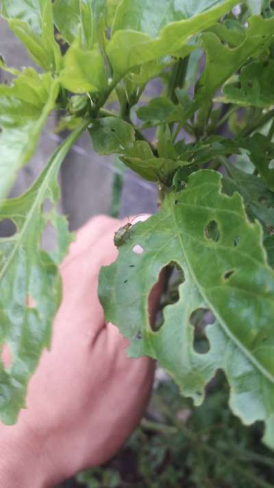 Olá trata-se de Vaquinha Verde veja receitas de uma calda repelente a seguir: Fumo de rolo (Nicotiana tabacum) Para controle de lagarta,vaquinha, larva minadora e pulgões Ingredientes: • 50 g de fumo de rolo picado • 250 ml de álcool. Misture o fumo com o alcool e deixe a mistura em repouso por pelo menos 24 horas. Veja receitas com fumo em: http://manejebem.com.br/publicacao/manejos/controle-alternativo-lagartas-calda-de-fumo http://manejebem.com.br/publicacao/manejos/controle-alternativo-pragas-calda-de-pimenta-e-fumo