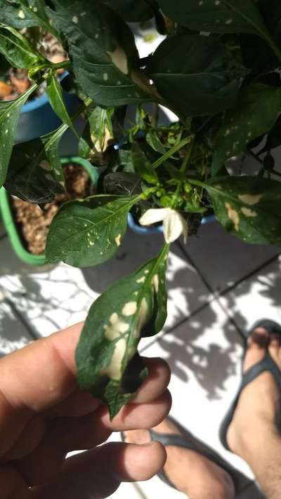 Essas manchas apareceram na minha pimenteira mas não se assemelha as opções mostradas no aplicativo. Vocês acham que sejam de origem bacteriana ou simplesmente queimadura de sol?