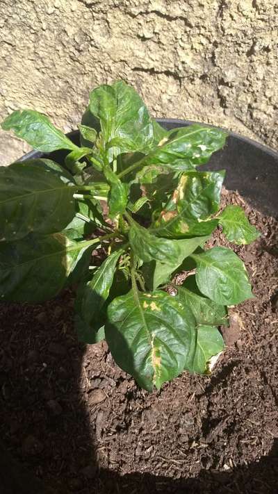 Essas manchas apareceram na minha pimenteira mas não se assemelha as opções mostradas no aplicativo. Vocês acham que sejam de origem bacteriana ou simplesmente queimadura de sol?