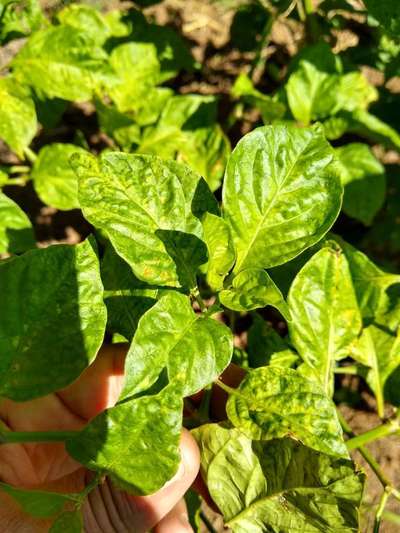 As pimentas estão ficando murchas, e as folhas com descoloração e pontos amarelos.