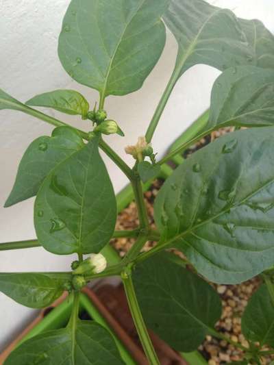 Meu pé de pimentão está dando apenas um pimentão saudável. Os outros botões dão apenas flores e elas caem, não dando crescimento ao fruto. Nesse mesmo vaso, tem mais 3 pés que dão flor e cai, sem frutos. Já adubei com Forth frutas, e continua a mesma coisa.... Antes, as flores caíam ainda na cor branca, agora elas só caem quando ficam um pouco bege. Estou na fase final do tratamento contra o vírus do mosaico. E também encontrei presença de formigas doceiras no vaso, mas os pés não estão com pragas (pulgões, cochonilhas, etc). Percebi também uma mancha escura, roxa, na bifurcação de ramificação. Se der zoom na foto, dá pra ver essas manchas. Acredito que não seja talo oco, porque eu já vi isso em um pé de manjericão que eu tive e os sintomas são diferentes...