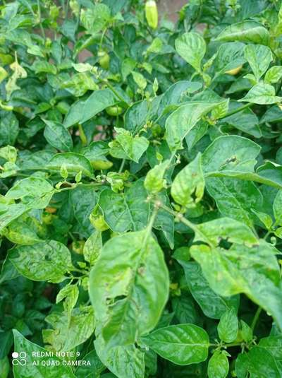 As folhas das pimentas estao retorcidas com mancchas e necroses e os frutos tambem.