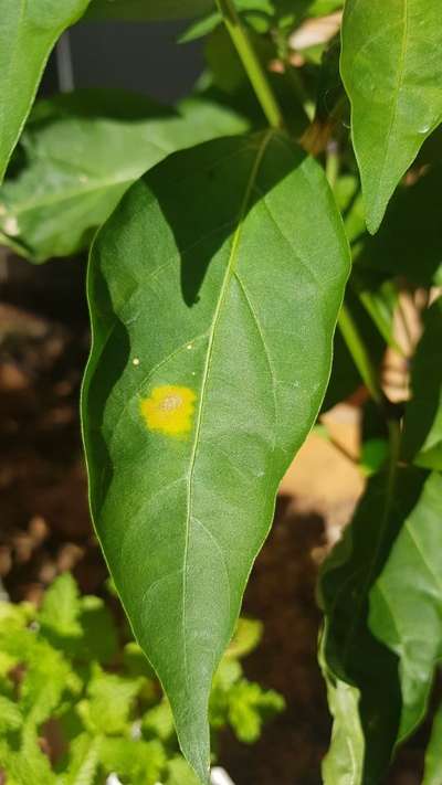 Manchas únicas em cada folha, bem definidas, com presença de formigas no verso da folha.