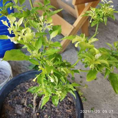 Tenho essa pimenteira, ela estava bem, com folhas verdes e crescendo, deu dois frutos e começou a ficar desse jeito com as folhas mais novas e as flores amarelando, ficando quase brancas. Qual nutriente ela precisa?? Eu tenho aqui Farinha de Osso, NPK 10-10-10, Esterco de Ave, Adubo Foliar 15-0-0, carvão, húmus de minhoca... Mas eu não sei se essas coisas resolveriam!