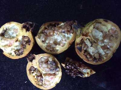 Ao colher as romãs e abri-las, notei que elas estão com partes escurecidas. Parece que o fruto está apodrecendo por dentro sem ter sinal algum na casca.