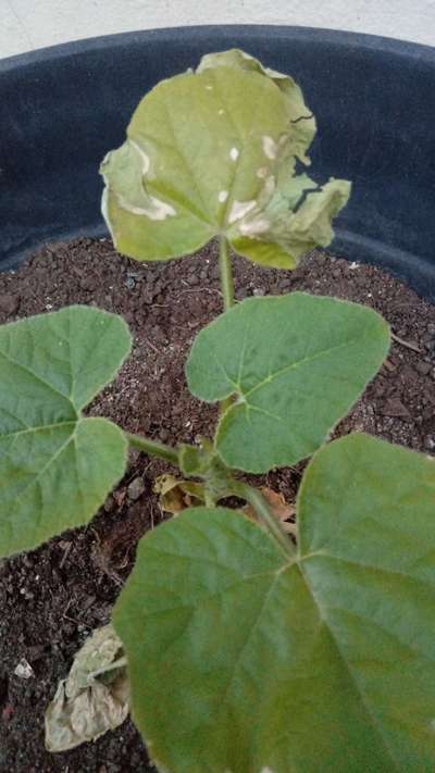 As folhas do broto de abóbora moranga estão ficando amrelas e quebradiça.