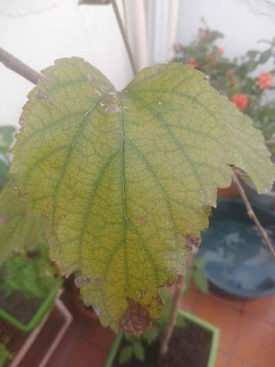 Minha amoreira já veio bem ruinzinha do horto e eu estou tentando fazê-la viver... Ela já veio assim, com as folhas um pouco amareladas, com manchas necroticas na cor bronze e com rasgos no meio da folha. Achei que poderia ser por conta da terra onde ela está. Então, adubei com Forth frutas, e mesmo assim a folha nova (última foto) também está nascendo amarelada e os botões são abortados. Já fizemos a poda de inverno. Ela está em terra adubada, pegando sol e claridade e recebendo água. O vaso é bem drenado. Os galhos que pegamos da poda viraram muda. E a muda está normal, dando folha e flor. O que pode estar acontecendo com a amoreira da foto?