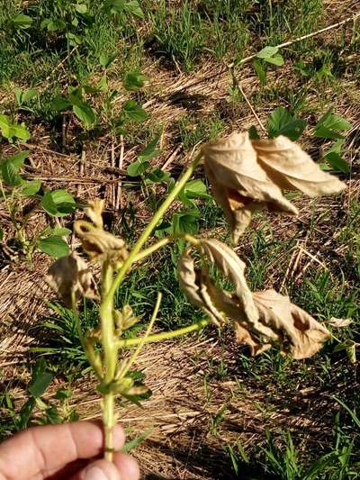Quebre o caule desta planta se estiver com uma cor escura é sinal phitofera, nada que uma boa rotação de cultura não.resolva
