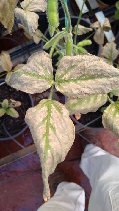 Saiba mais sobre o PlantixFolhas murchas e algumas quebradiças com quedas posteriormente, haste verde e vagem sem danos