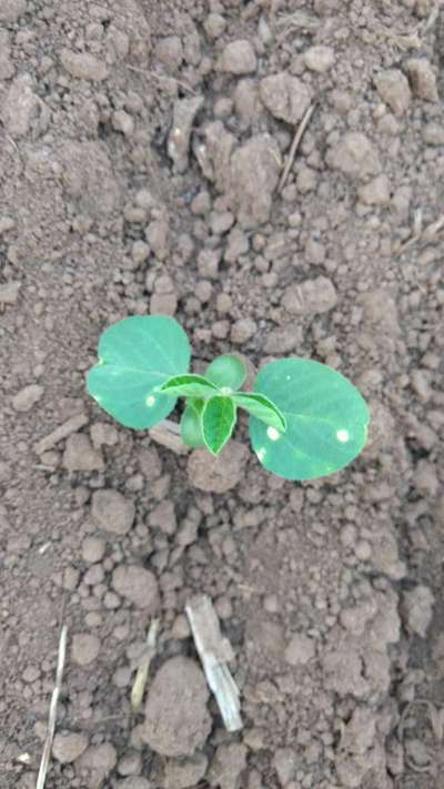 Oque pode ser essas manchas brancas que aparecem nas primeiras folhas da soja ? Tem algo relacionado com seca ou adubação?