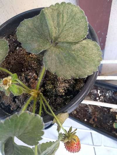Morangueiro não se desenvolve. As folhas perdem o viço e muitas vezes as bordas das folhas secam. Os frutos também secam ou dão escuros, muito feios.