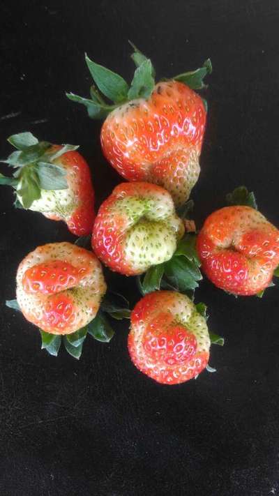 Hello dear Manoel Nascimento how are you dear as per your image it's seem to be deformed strawberry issue dear strawberries are caused by external, usually damaging agents. Feeding by tarnished plant bugs or certain types of mites will cause them. Cold injury (specifically frost damage to the pistillate part of the flower) and nutrient deficiencies (particularly a lack of calcium or boron) will cause deformed strawberries to form. Additionally, inadequate pollination can result in poorly formed strawberries. Another cause for the formation of nubbins is very hot temperatures (the high temperatures damage the pollen viability