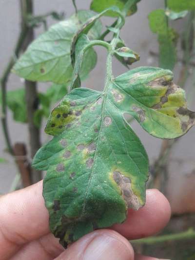 Olá! Veja a possibilidade de ser Mancha fungica do Tomate. No link a seguir tem mais algumas informações Mancha-de-septoria / Septoriose