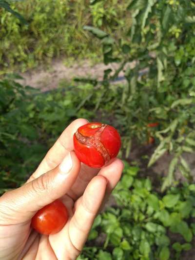 olá! a rachadura dos frutos podem ocorrer devido a variações de umidade e irrigação. Pode ser Cicatrizes em Zíper no Tomate